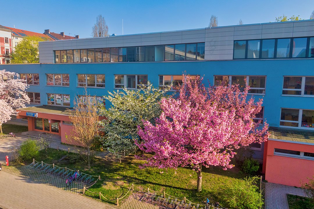Unser Haus liegt im Prenzlauer Berg, direkt am Kollwitzplatz. Es wurde im Mai 1975 eröffnet und 2007/08 vollständig saniert und erweitert. In der Kita werden derzeit 240 Kinder im Alter von 11 Monaten bis 6 Jahre in zehn altersgemischten und altershomogenen Gruppen von 41 Erzieher*innen plus drei Erzieher*innen in berufsbegleitender Ausbildung betreut. Zehn helle großzügige Räume, die zum Spielen und Erkunden einladen, sowie ein naturnah angelegter Garten, der viele Bewegungs- und Rückzugsmöglichkeiten bietet, sind für und mit den Kindern geschaffen worden. Täglich frisch zubereitetes Essen ist uns sehr wichtig. Unser Küchenteam sorgt für einen abwechslungsreichen Speiseplan mit Zutaten aus der Region oder aus biologischem Anbau und berücksichtigt ernährungsbedingte Besonderheiten.