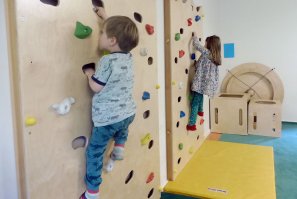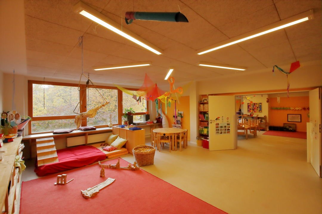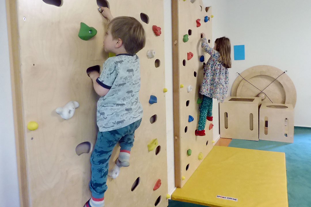 Damit die Kinder sich in unserem Haus wohl fühlen und sich entfalten können, gibt es einige Aktionsräume und Gruppenräume mit einer breiten Palette an Materialien, z.B. unsere großen Bewegungsräume, wo eine Bewegungsbaustelle, Kletterwände, Kletterturm und andere Bewegungselemente für den starken Bewegungsdrang der Kinder zur Verfügung stehen. Auch künstlerische Bereiche finden bei uns ihren Platz: Atelier, Kinderküche usw. Auch der Garten bietet viel Raum für Aktivitäten, Pflanzbeete, Weidentunnel und Kletteranlagen.