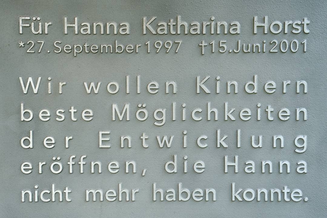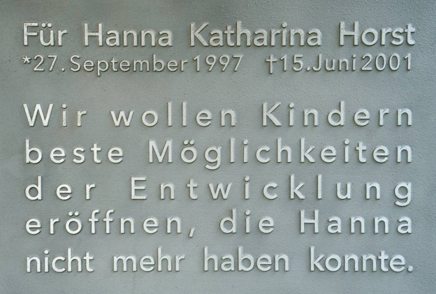 Wir arbeiten im Gedenken an Hanna Katharina Horst. Bis zu ihrem tragischen Unfall 2001 besuchte sie die Kita Löwenzahn. Sie befördert unsere Spontaneität und eine unverstellte Sicht auf die Wirklichkeit bis heute. Wir denken auch an Renate Schaaf, unsere langjährige Pädagogische Leitung, und nutzen ihre Stärke, ihren Gestaltungswillen auch bei unseren künftigen Projekten.